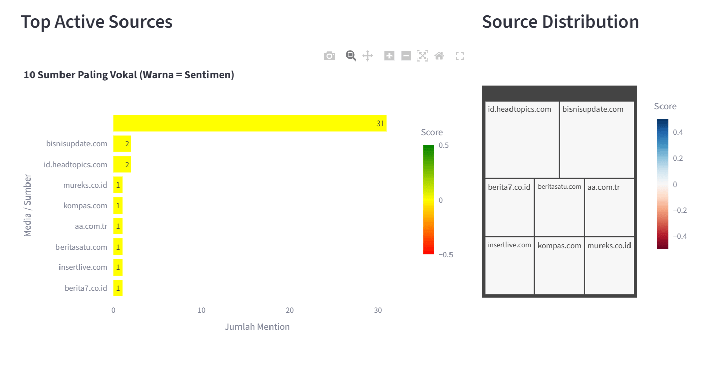 Secara keseluruhan, pola ini menggambarkan ekosistem informasi yang stabil namun rapuh. Stabil karena tidak ada eskalasi sentimen negatif atau positif, namun rapuh karena ketergantungan pada satu sumber dominan membuat opini publik sangat mudah berubah apabila sumber tersebut mengubah framing atau jika media besar lain mulai masuk dengan sudut pandang yang lebih tajam. Dalam konteks brand monitoring, kondisi ini adalah fase observasi publik yang dapat dengan cepat bergeser begitu muncul pemicu isu baru.
